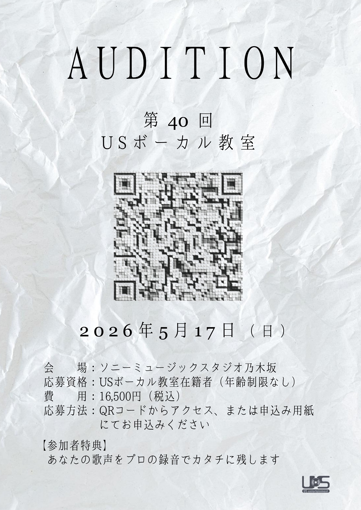 第40回USボーカル教室オーディションの募集を開始しました。